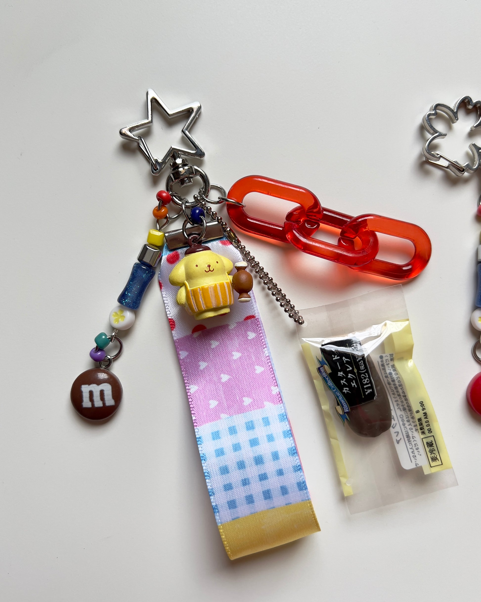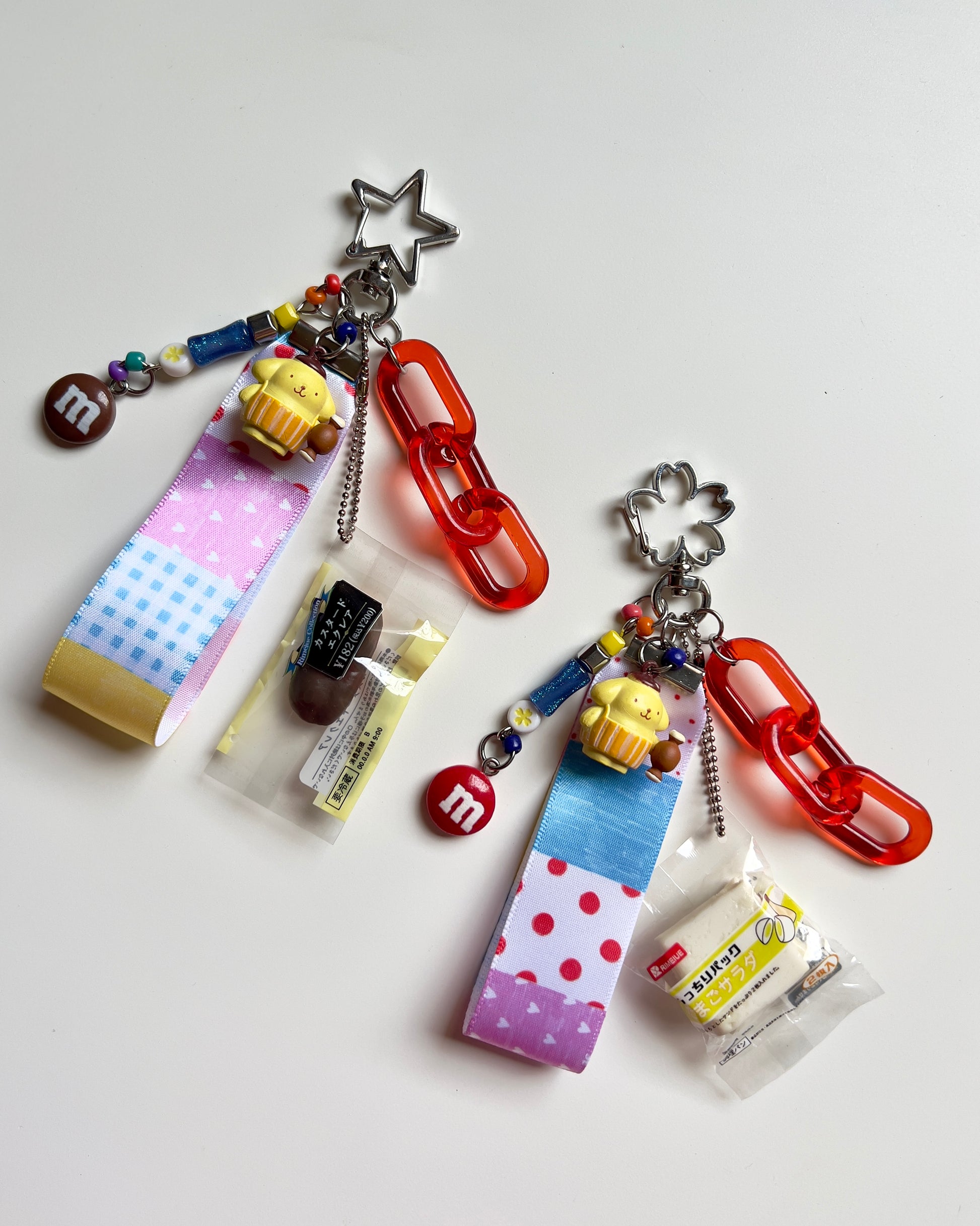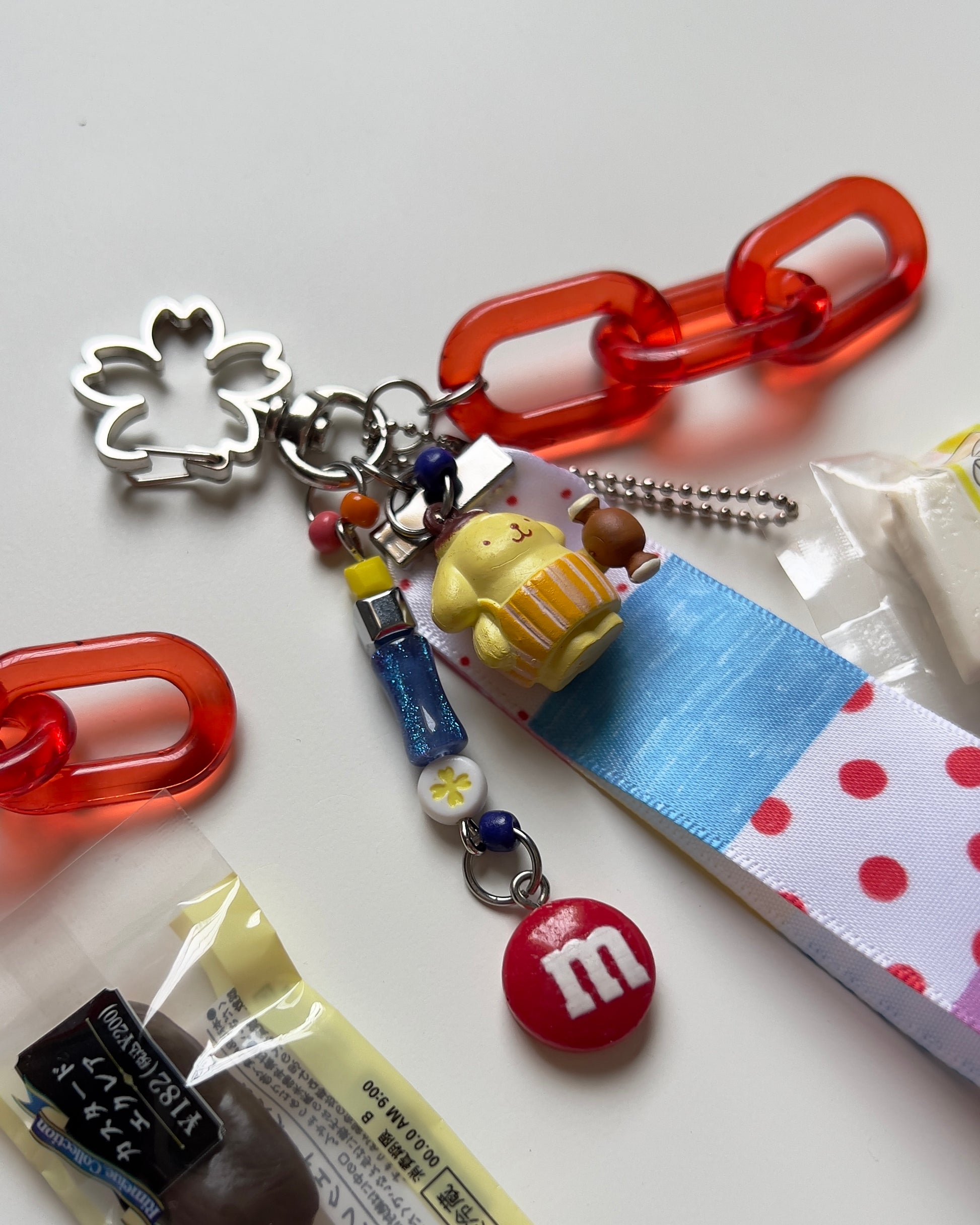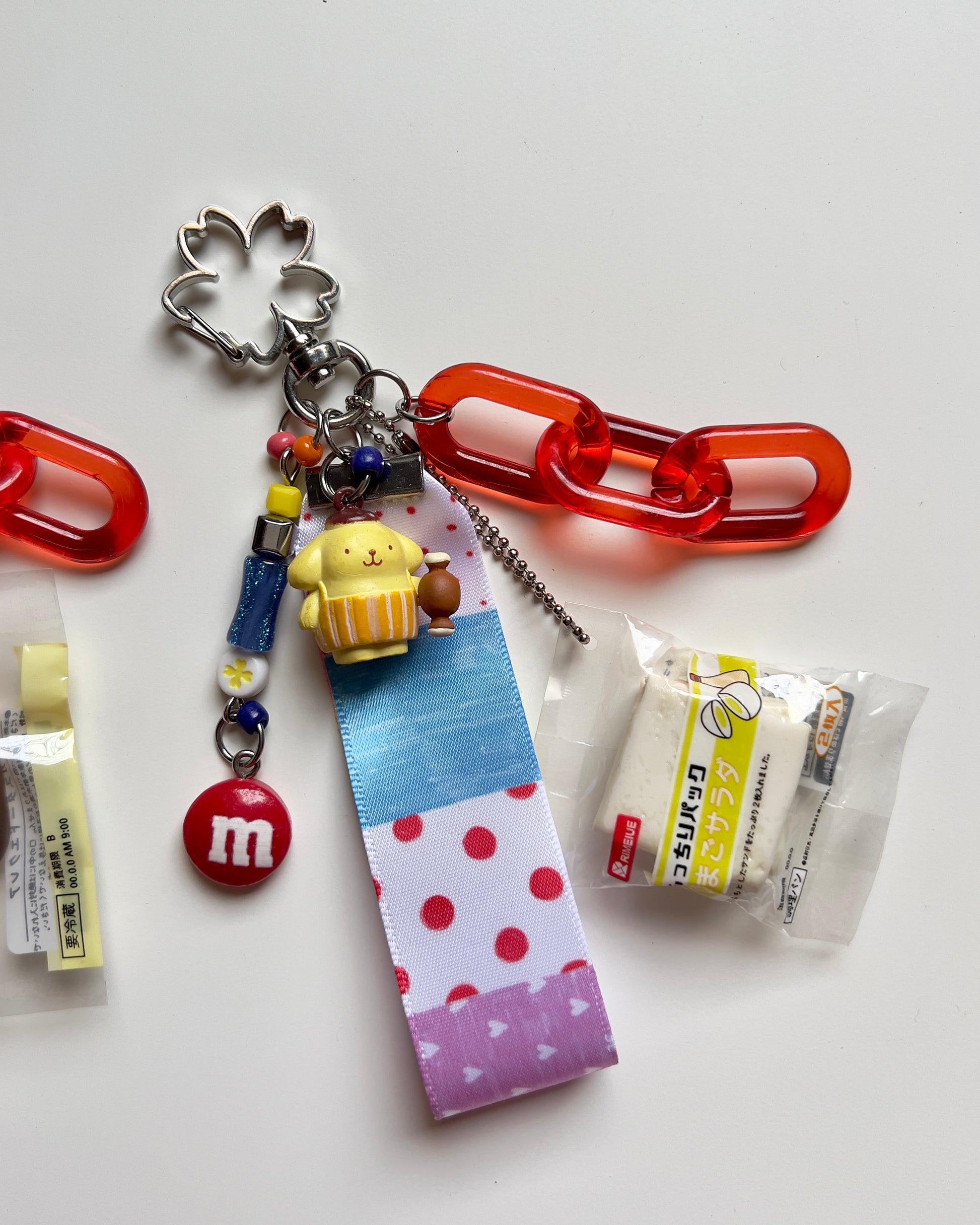 مدالية Pompompurin اصلية من sanrio، شريط ستن designed، مدالية سكوشي حلويات يابانية، خرز زجاج و بلاستك و التعليقات مضادة للصدأ.